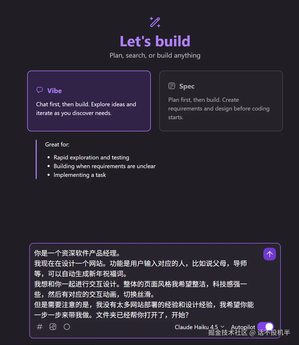 - Vibe 模式像聊天一样直接下达需求,kiro会即时执行;