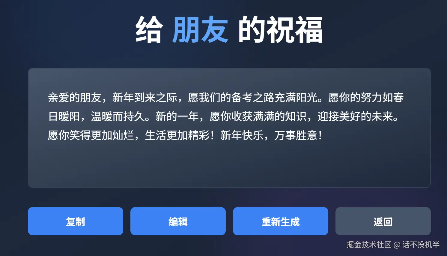 为快速验证交互流程,初期Demo在代码里会内置固定的祝福词模板。页面的逻辑没问题后,可以专心集成api。