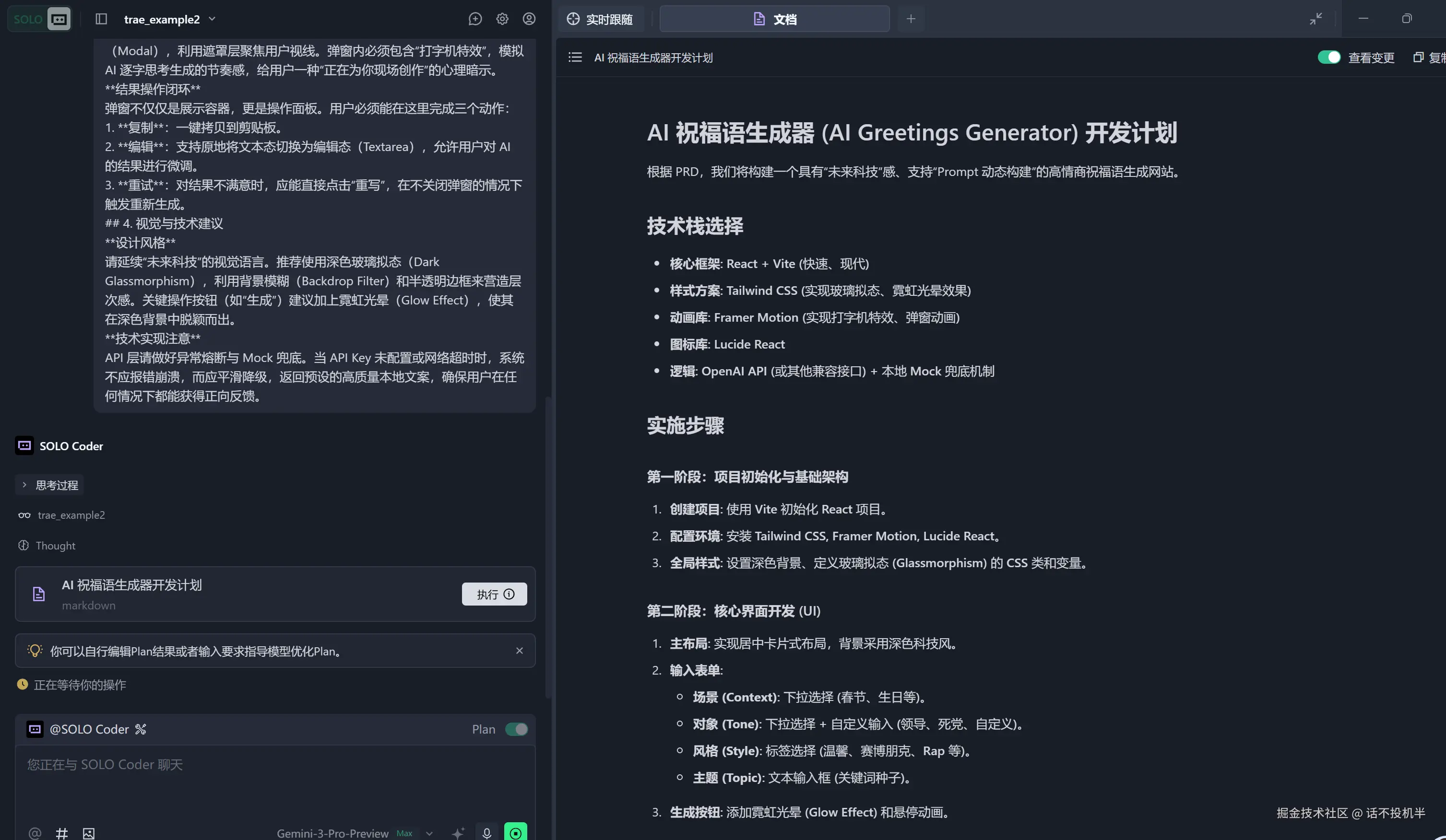 将上一阶段生成的PRD文档复制发给trae。让其自动规划开发: