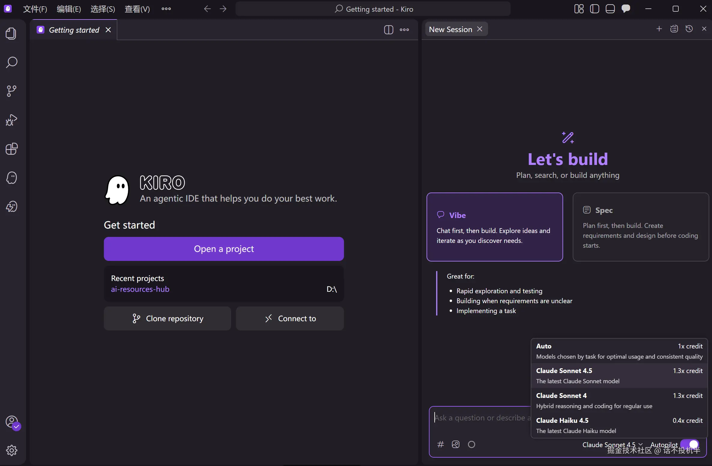 kiro是亚马逊出品的AI 驱动 IDE,界面风格主色调为紫色。ai对话样式为右上角的对话框,支持左右双侧调用,整体布局与传统IDE有一些区别。