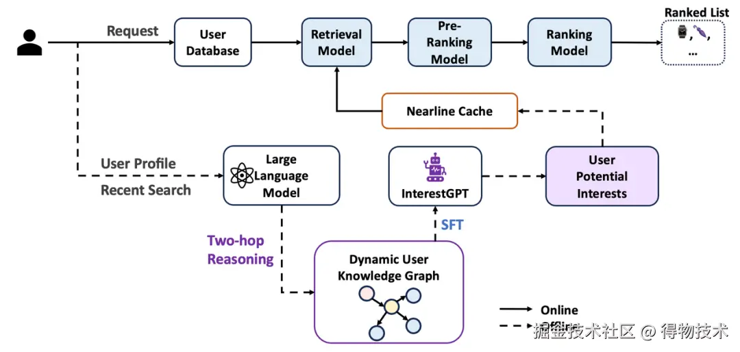 同时随着大语言模型(LLM)的发展,世界知识提取的效率逐渐得到提升,为打破信息茧房,提高用户内容消费的新鲜感带来了新的机遇。我们提出用大语言模型(LLM)来动态构建用户知识图谱(User Knowledge Graph),并在知识图谱上进行更可控的推理来挖掘用户“潜在兴趣”,再把这些潜在兴趣以工程可落地的方式接入工业推荐链路,在得物社区业务场景取得了显著的消费指标收益。