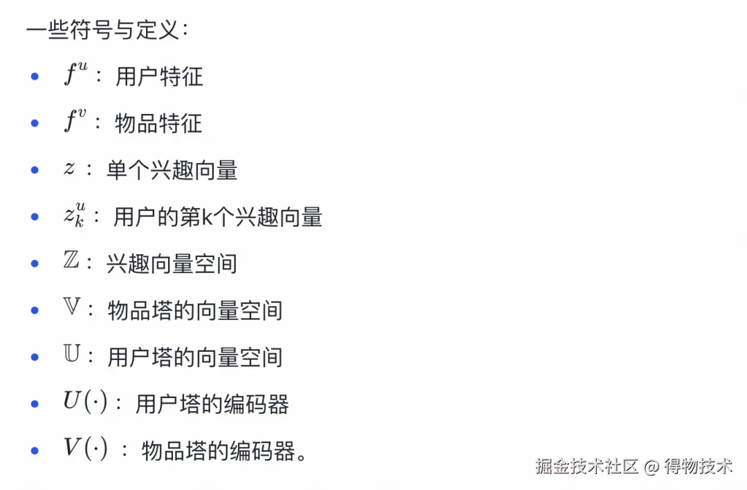 用户塔的输入特征包括:用户静态画像如:年龄、性别等,用户历史交互物品序列特征如类目、品牌、标签等,这些特征通过id-emddding的方式表征为fᵘ;用户兴趣,用户兴趣通过文本编码器获得