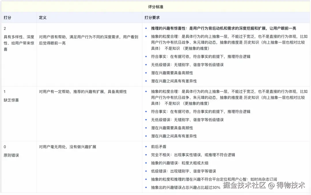 我们用deepseek-r1生成的3万条数据做标注样本,对qwq-32b模型经过sft后得到模型interestGPT,使用离线评估标准对interestGPT在1万条测试集上评估,抽样1000个用户评估结果如下: 0分占比:1%,1分占比:3%,2分占比:96%。