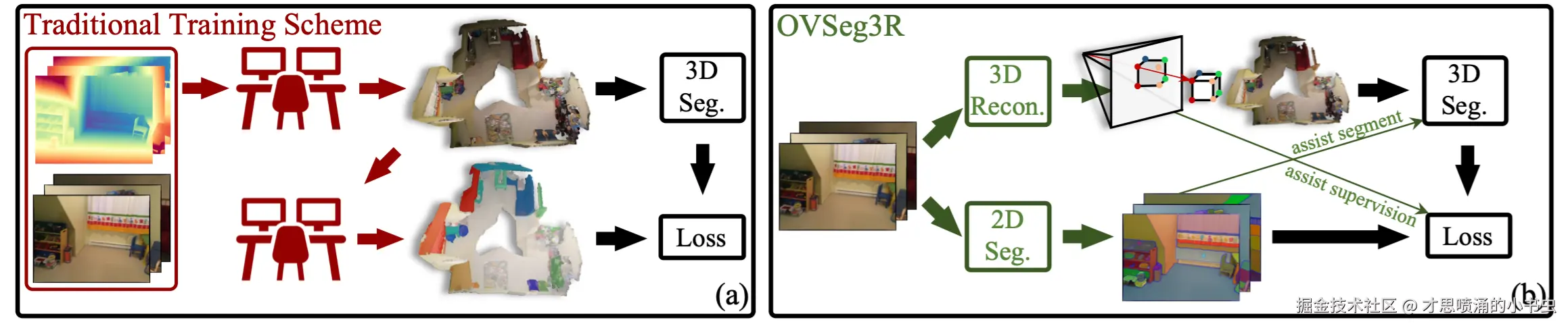 图1 左图为传统的训练方案;右图是 OVSeg3R 的训练方案