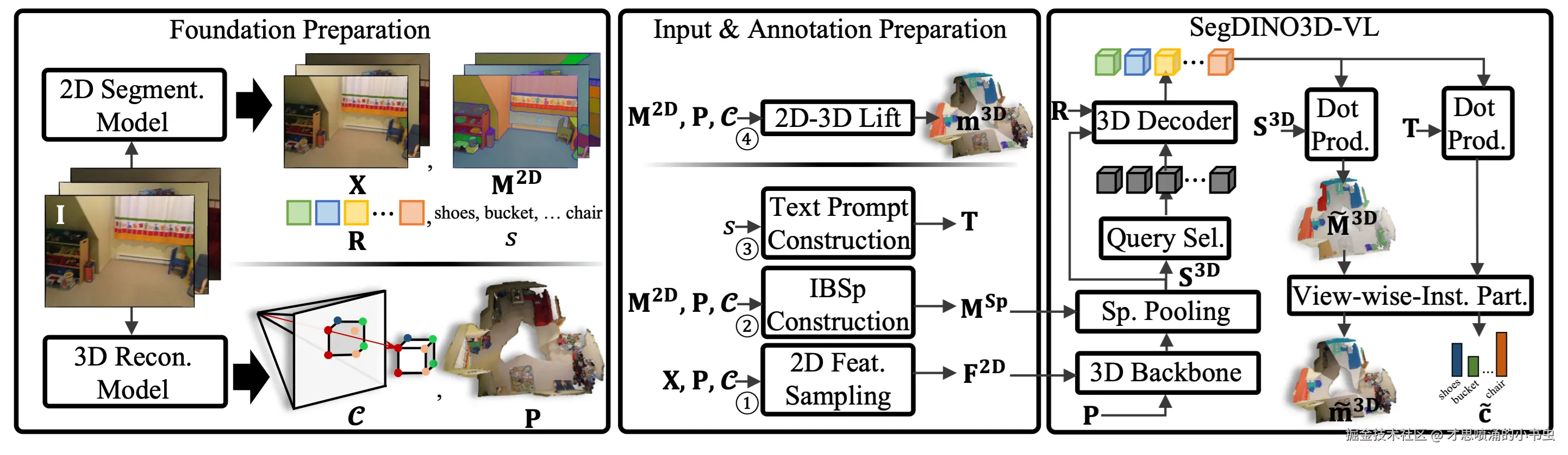 首先,研究团队会输入一段场景视频。这段视频会被分成两条路径处理:一条路径送入 3D 重建模型,生成场景的 3D 点云(也就是立体模型),同时得到 2D 图像像素与 3D 点云坐标的对应关系;另一条路径送入成熟的 2D 分割模型,在获得图像级、物体级的特征(作为 SegDINO3D 特征补充)的同时,也会提供 2D 实例分割结果,以及对应的各个实例的类别名称。