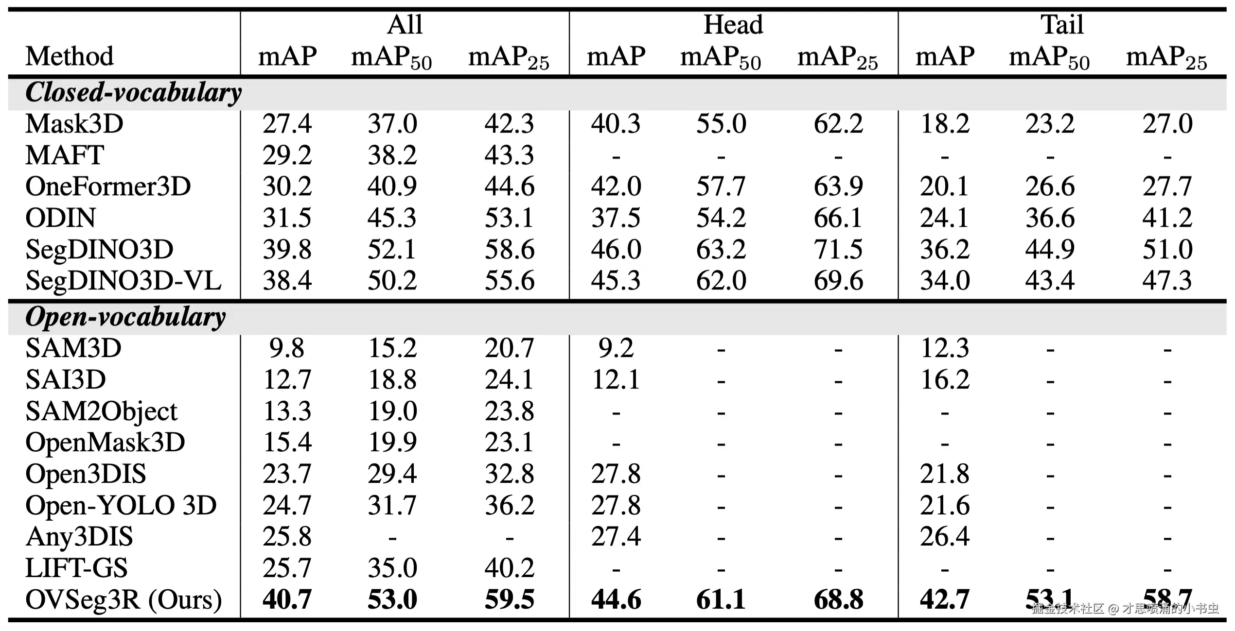 通过上述方案创新,OVSeg3R 在极具挑战性的 ScanNet200 3D 实例分割基准测试中,不仅大幅超越所有现有开集模型,同时刷新了闭集模型的最新记录,将长尾类与头部类的性能差距从 11.3 mAP 骤缩至 1.9 mAP,彻底改善类别性能不均衡问题。