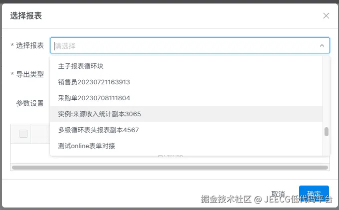 - 选择报表:下拉选择积木报表中已设计的报表,支持搜索。
