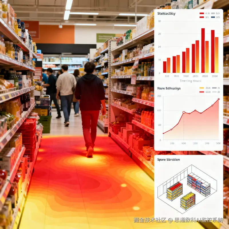 - 区域热力图(Heatmap Generation): 将顾客的累计停留时间和移动轨迹投射到门店平面图上,实时生成高精度热力图,直观展现门店的客流聚集地和冷门区。