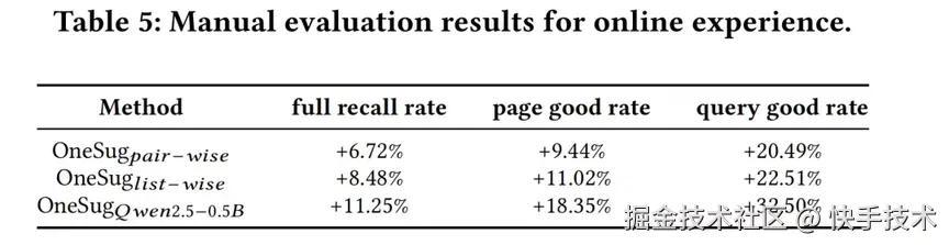 OneSug 模型目前在快手电商搜索场景下全量推全,AB 实验大幅度提高了 Ctr、订单和 GMV 等指标,同时人工测评 GSB 指标也有很大幅度的提升。