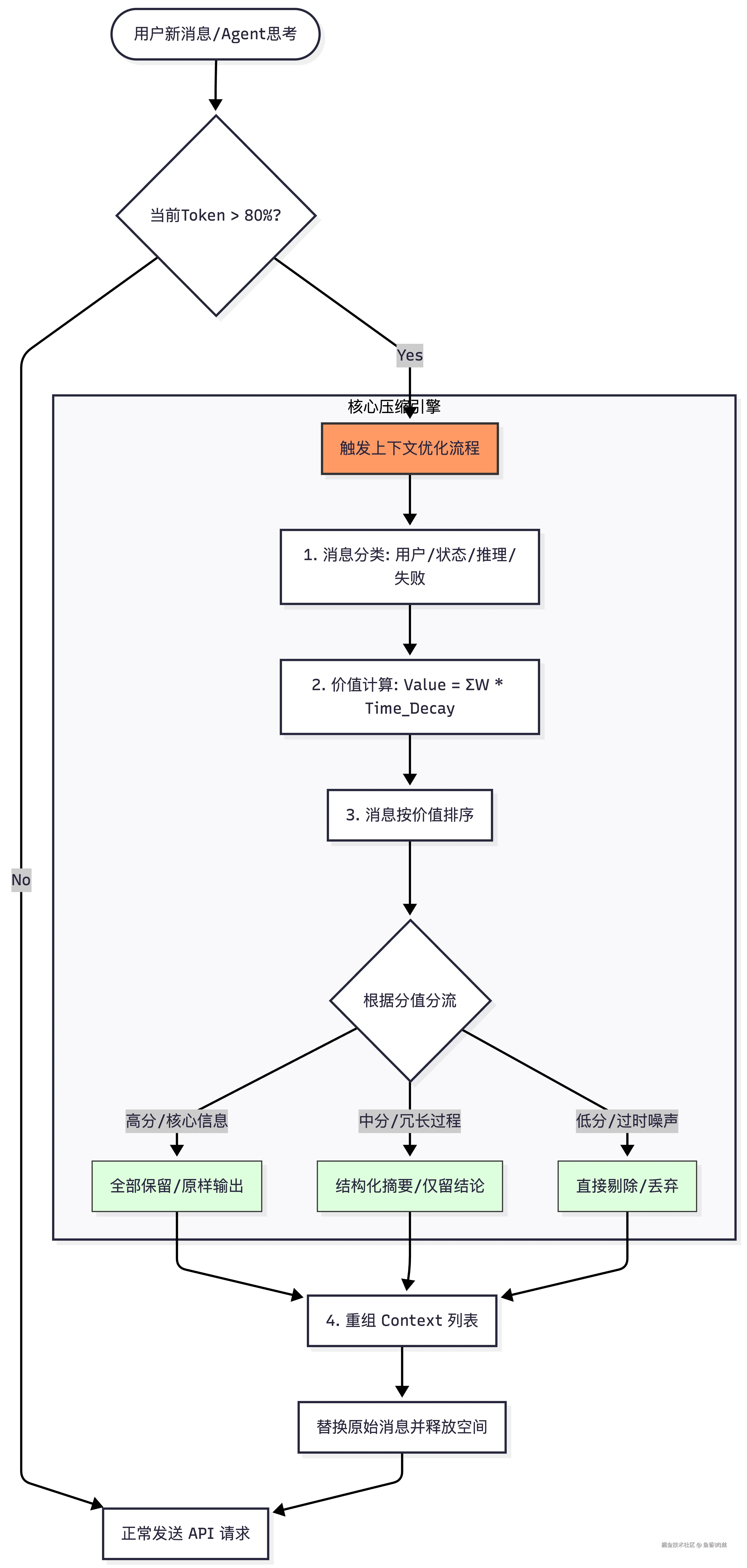 接下来进行压缩的时候就可以对消息列表进行一个遍历,对所有消息进行打分、排序,设置一个多个阈值进行不同的处理,最后用压缩后的消息替换原始消息,便可以释放上下文空间