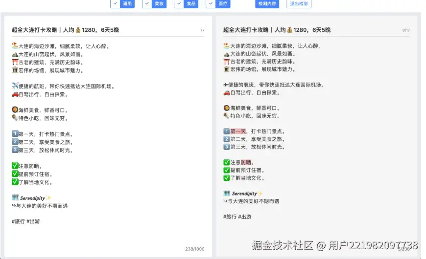 ・内容违禁词检测: 【文案写完后一键扫描,精准标出广告法违禁词、平台敏感词,还提供合规替换建议】+ 比如把“最有效”改成“亲测有效”,“第一”改成“TOP级”,检测准确率高达98%