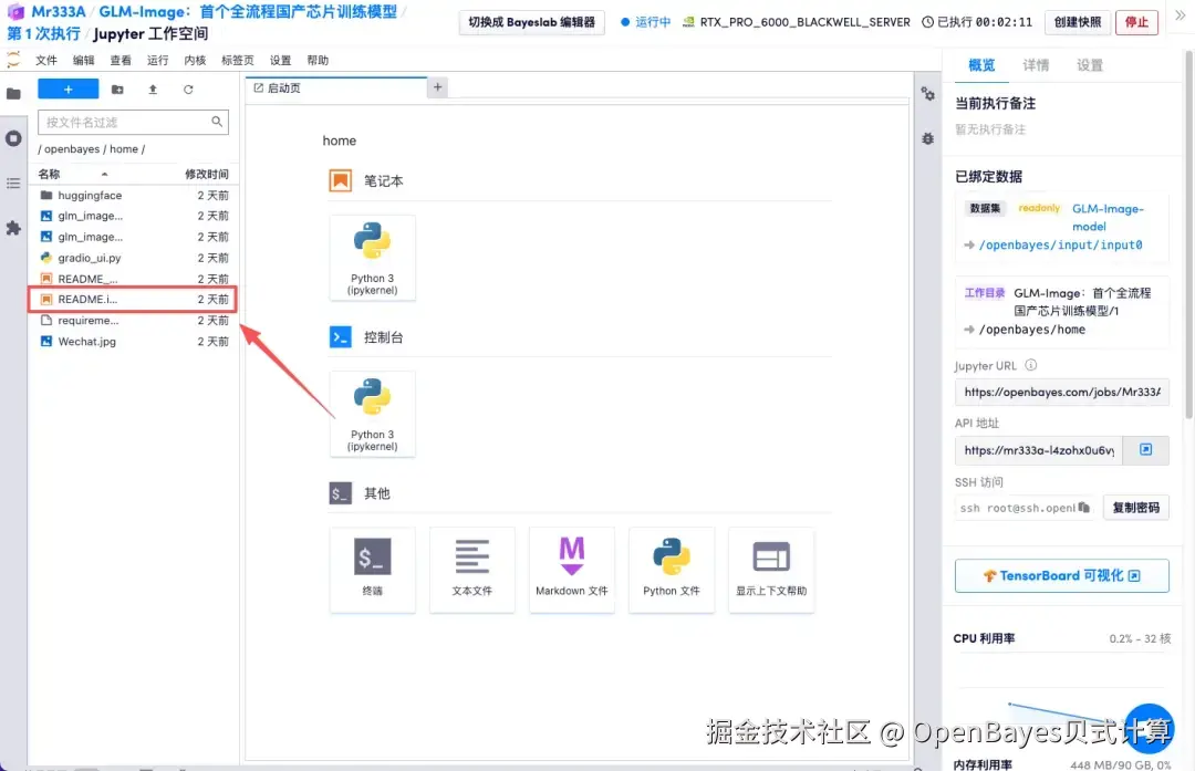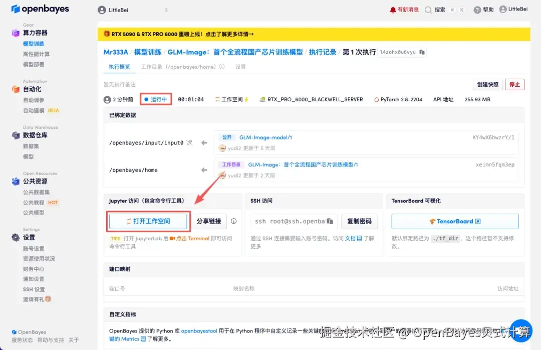 4.等待分配资源,当状态变为「运行中」后,点击「打开工作空间」进入 Jupyter Workspace。