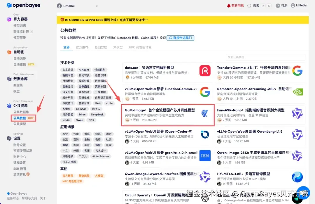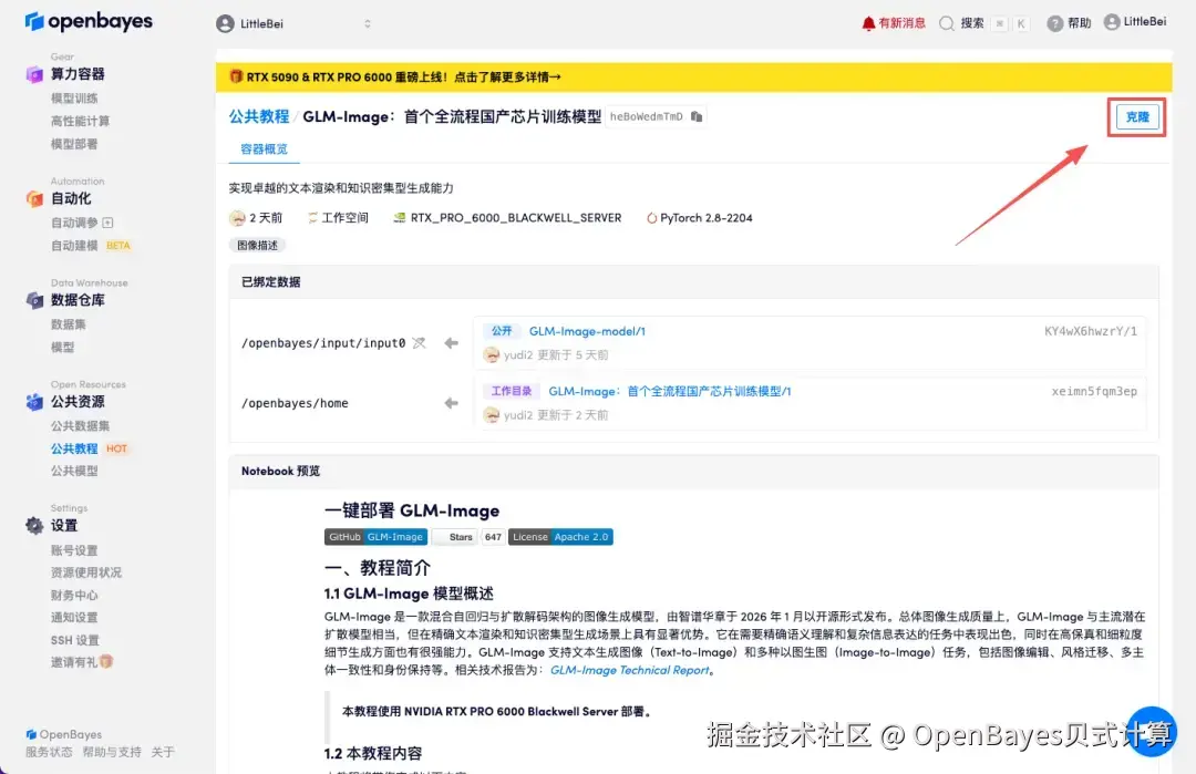 1.登录 OpenBayes.com,在「公共教程」页面,选择「GLM-Image:首个全流程国产芯片训练模型」教程。
