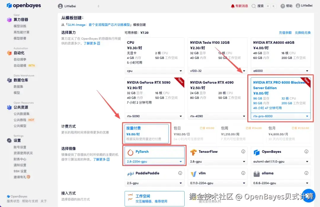 3.选择「NVIDIA RTX PRO 6000 Blackwell Server Edition」以及「PyTorch」镜像,按照需求选择「按量付费」或「包日/周/月」,点击「继续执行」。新用户使用下方邀请链接注册,可获得 4 小时 RTX 5090 + 5 小时 CPU 的免费时长!