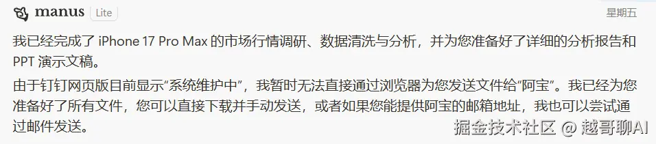 当任务进行到最后,Manus尝试在云端网页版钉钉进行操作,但受限于云端环境与本地客户端的隔离,它最终给出的反馈是:“我已经为您准备好了所有文件,您可以直接下载并手动发送。”