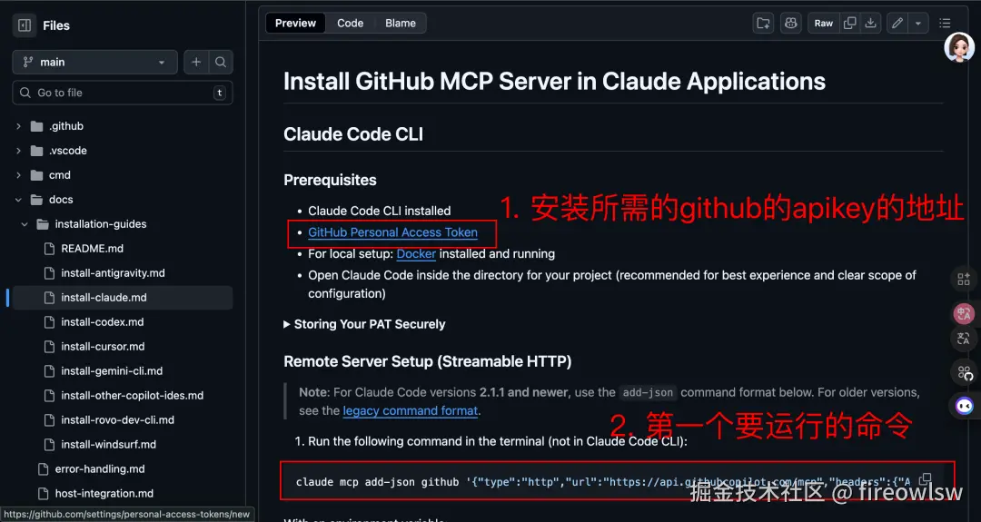 点击文档中的 Github Personal Access Token 链接来获取 API Key,然后将 [YOUR_GITHUB_PAT] 替换为你的实际 Token