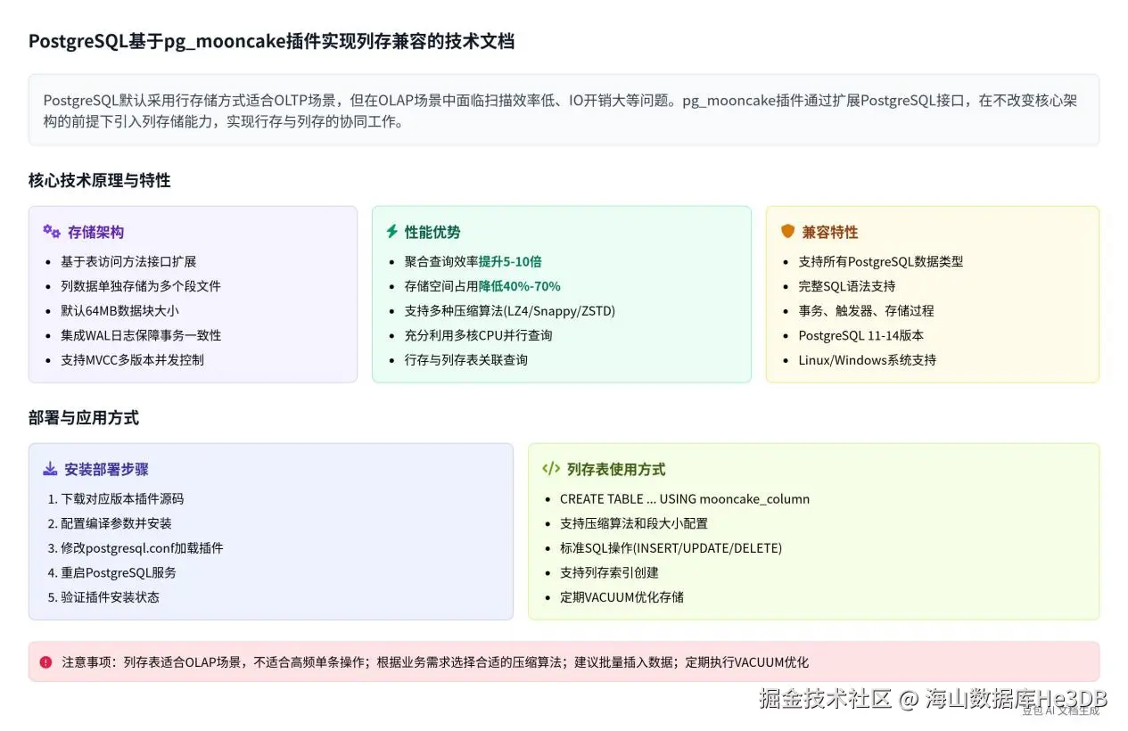 pg_mooncake插件通过扩展PostgreSQL的表访问方法接口,构建了高效的列存储引擎,实现了PostgreSQL的列存兼容。其核心优势在于高效的列存储能力、与PostgreSQL原生功能的高度兼容、灵活的压缩策略以及行存与列存的协同工作能力,能够有效提升OLAP场景下的查询性能,同时兼顾OLTP场景的事务处理需求。