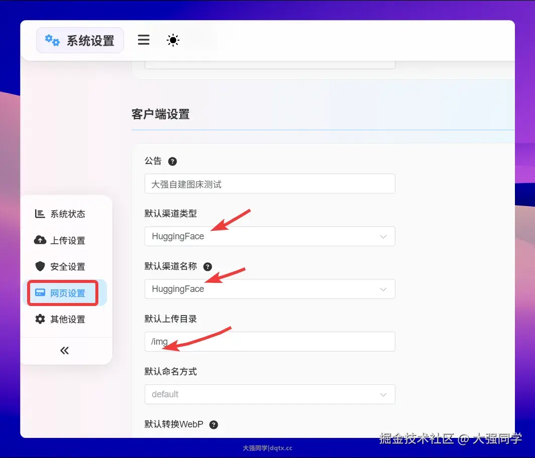 - 进入「页面设置」→「客户端设置」,将默认上传渠道设为刚添加的 HF 渠道。