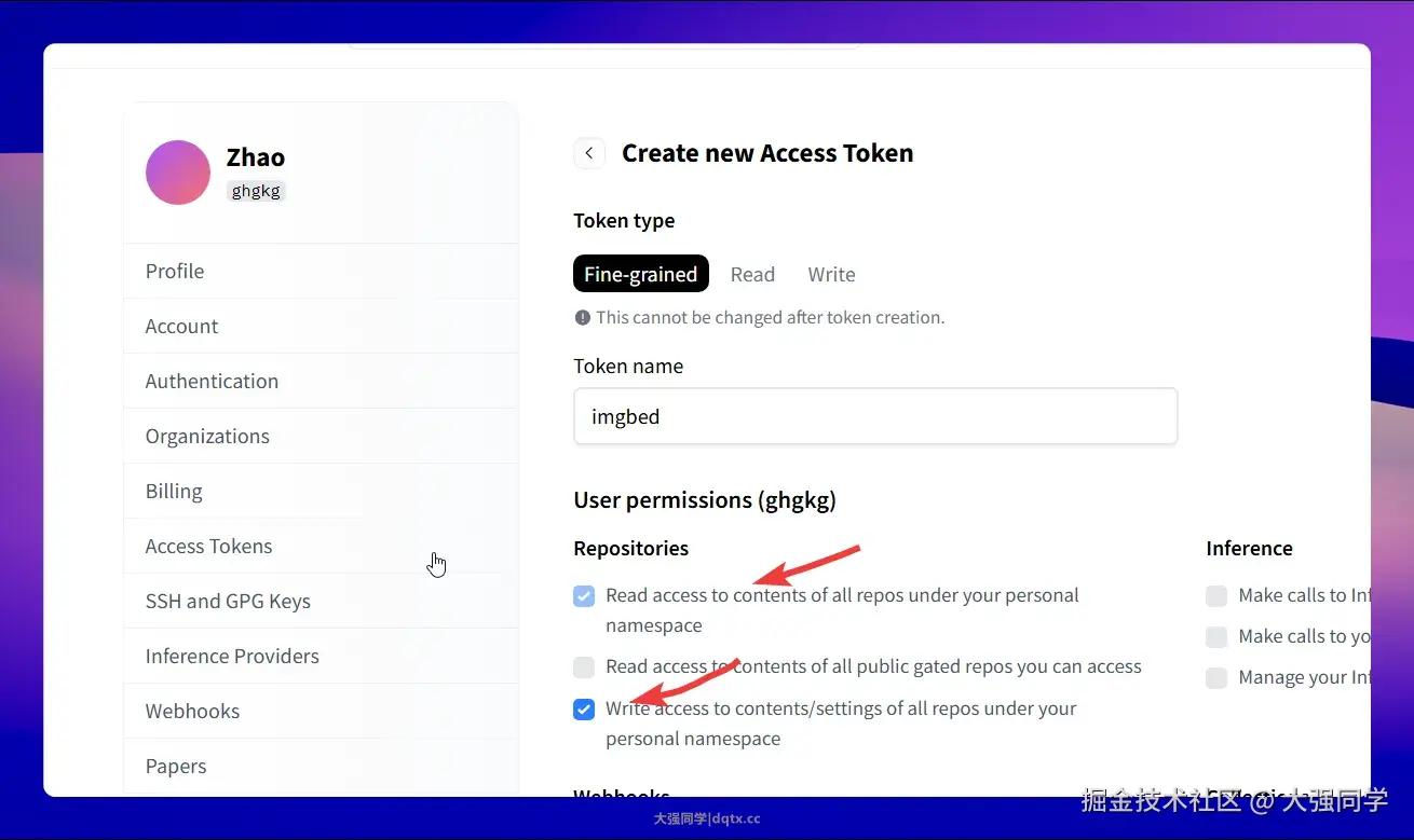 - 进入 HuggingFace「设置」→「Access Tokens」→「Create New Token」;