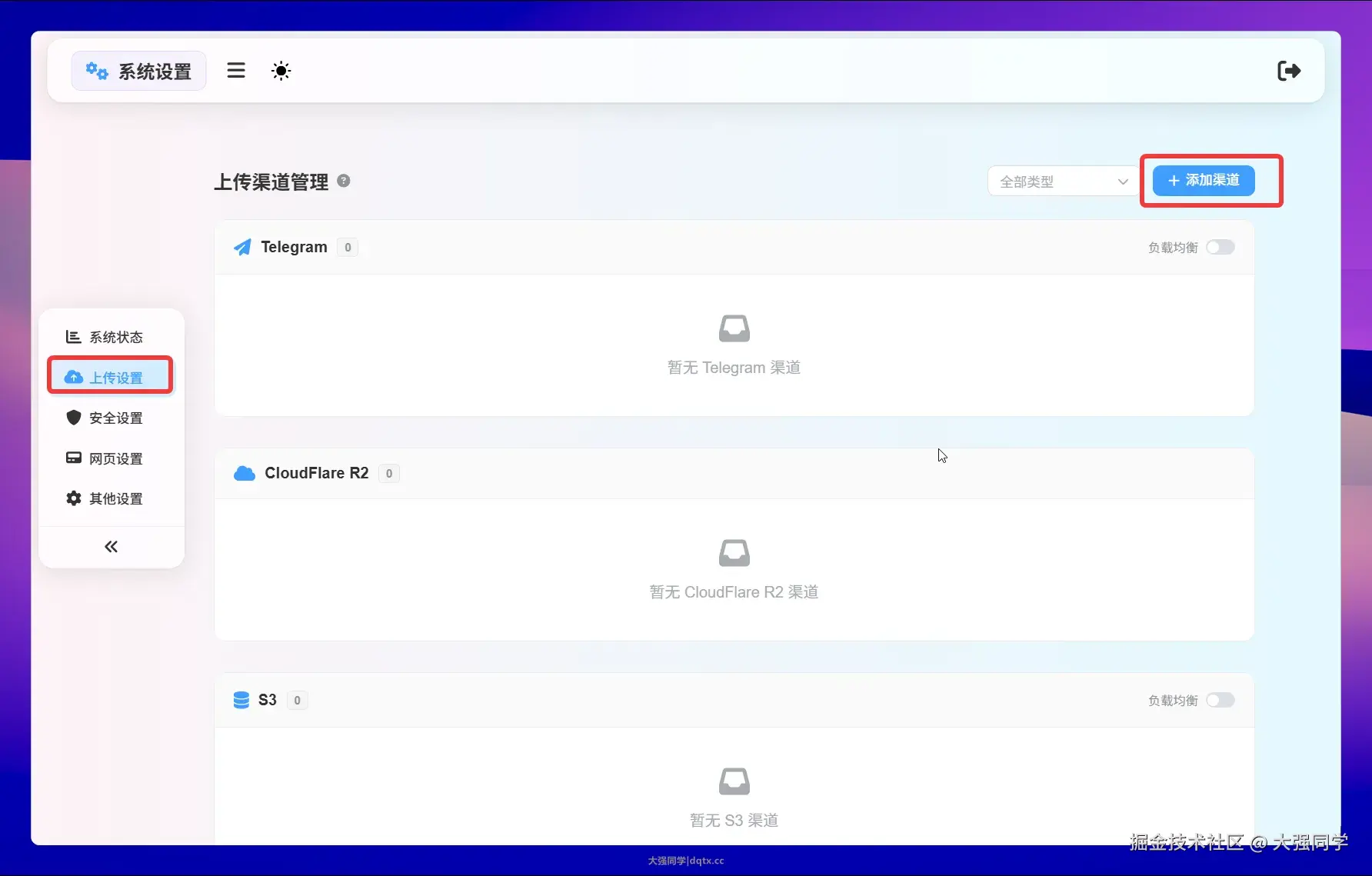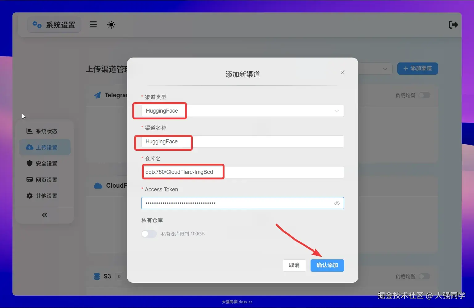 /dashboard(如https://你的域名/dashboard); - 进入「系统设置」→「上传设置」,添加 HF 渠道: