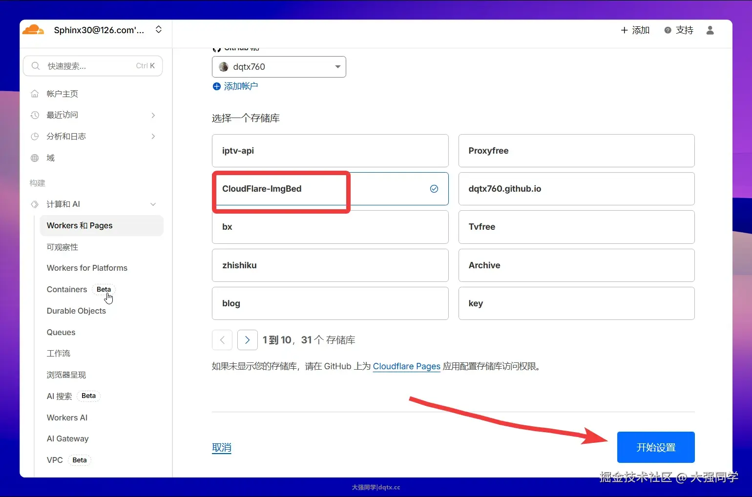 - 选择刚 Fork 的「CloudFlare-ImgBed」项目,点击「开始设置」;