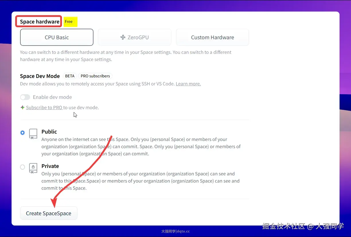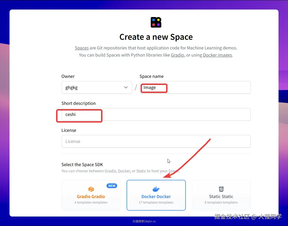 - 仓库名填「HuggingFace 用户名 / 空间名」(如