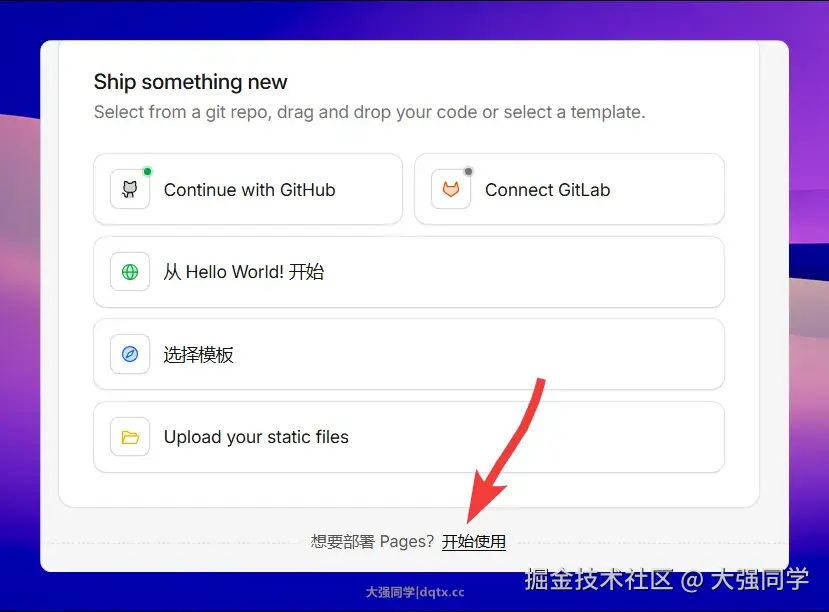 在页面的右上角点击【创建应用程序】,然后点击下面的想要部署 Pages?的【开始按钮】。如下