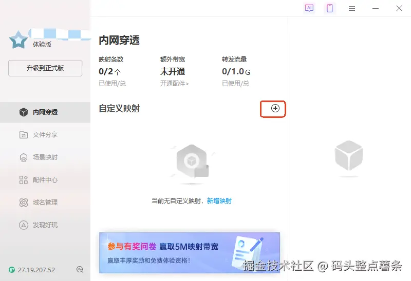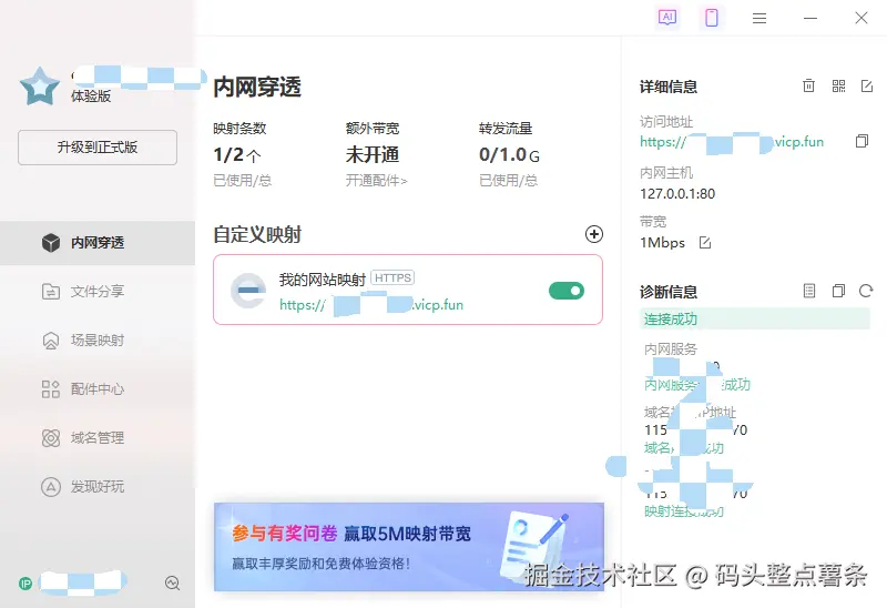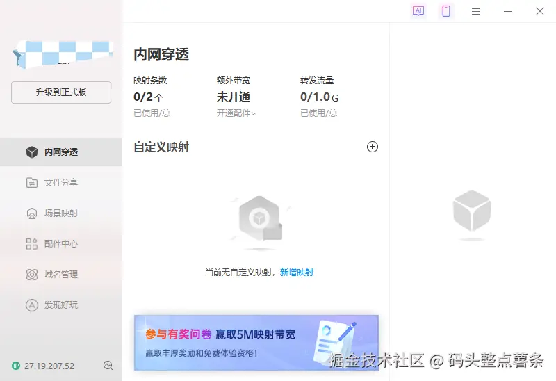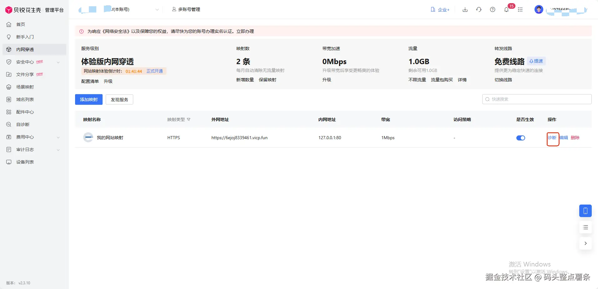 由于是免费使用的,限制你映射 2 个,每月只有 1GB 的流量,需求大的话可以进行付费。