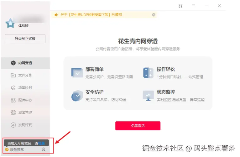认证完成后重启一下花生壳,会更新你的实名认证,现在会提示你暂时没有可以域名,点击右侧的红色按钮,免费激活