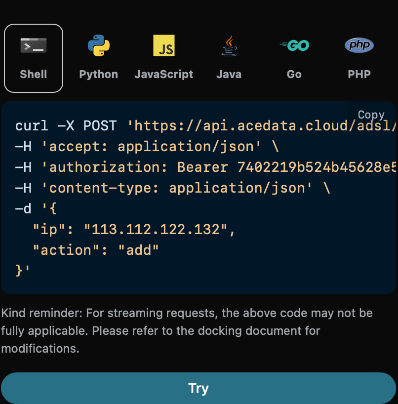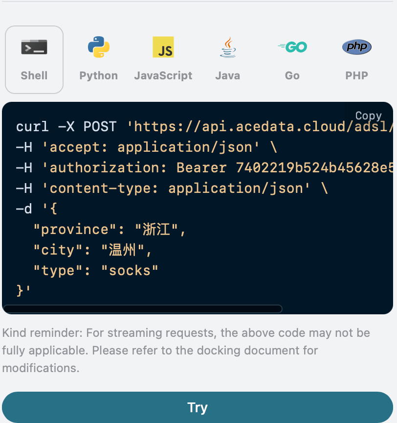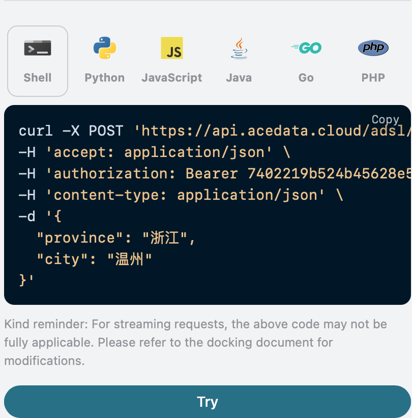 同时您可以注意到右侧有对应的调用代码生成,您可以复制代码直接运行,也可以直接点击「Try」按钮进行测试。