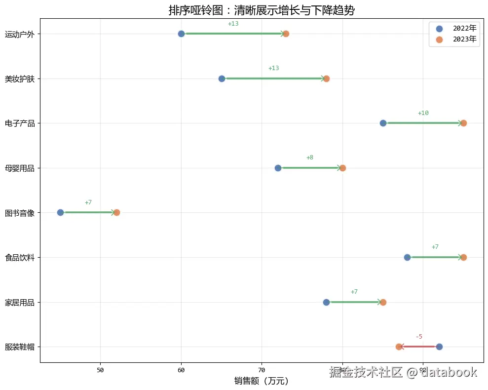 进一步,我们还可以给哑铃图排序,按照增长由快到慢给各个品类排序,这样自然形成从"下降最显著"到"增长最显著"的连续谱,模式自动显现,无需刻意寻找。