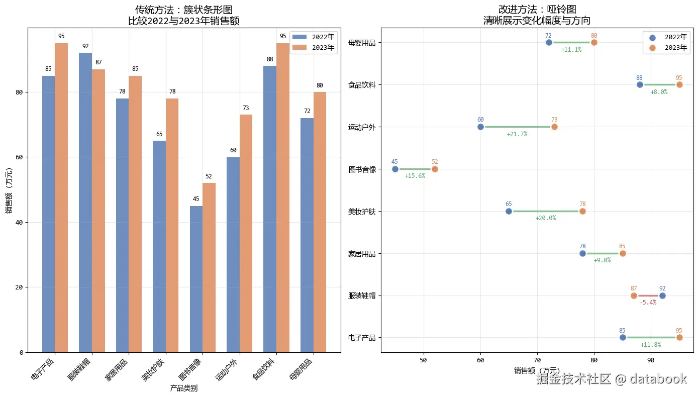 这时,传统的做法是使用堆积条形图或簇状条形图,但它们存在一个共同问题:当我们需要精确追踪每个项目在两个时间点或两种条件下的变化时,这些图表会让我们的眼睛在条形之间来回跳跃,难以直观把握变化的幅度和方向。