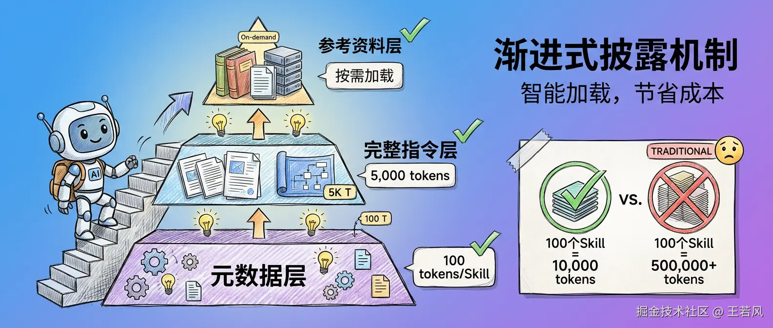 Skills 之所以强大,是因为它采用了"渐进式披露"(Progressive Disclosure)的设计。