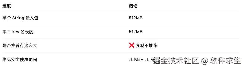 “512MB 是理论上限,但生产中我们严格限制 String 大小,超过阈值一定会拆分或者换存储方案。”