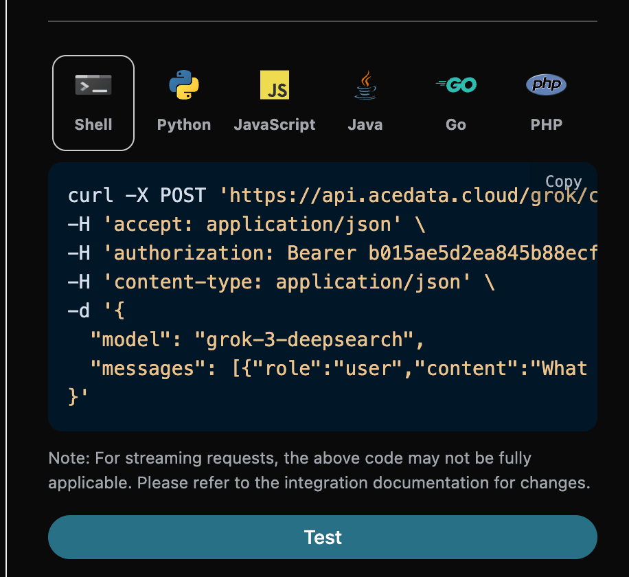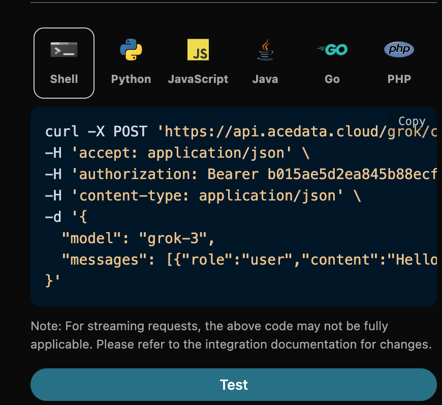 要使用 Grok Chat Completion API,首先可以到 Grok Chat Completion API 页面点击「Acquire」按钮,获取请求所需要的凭证: