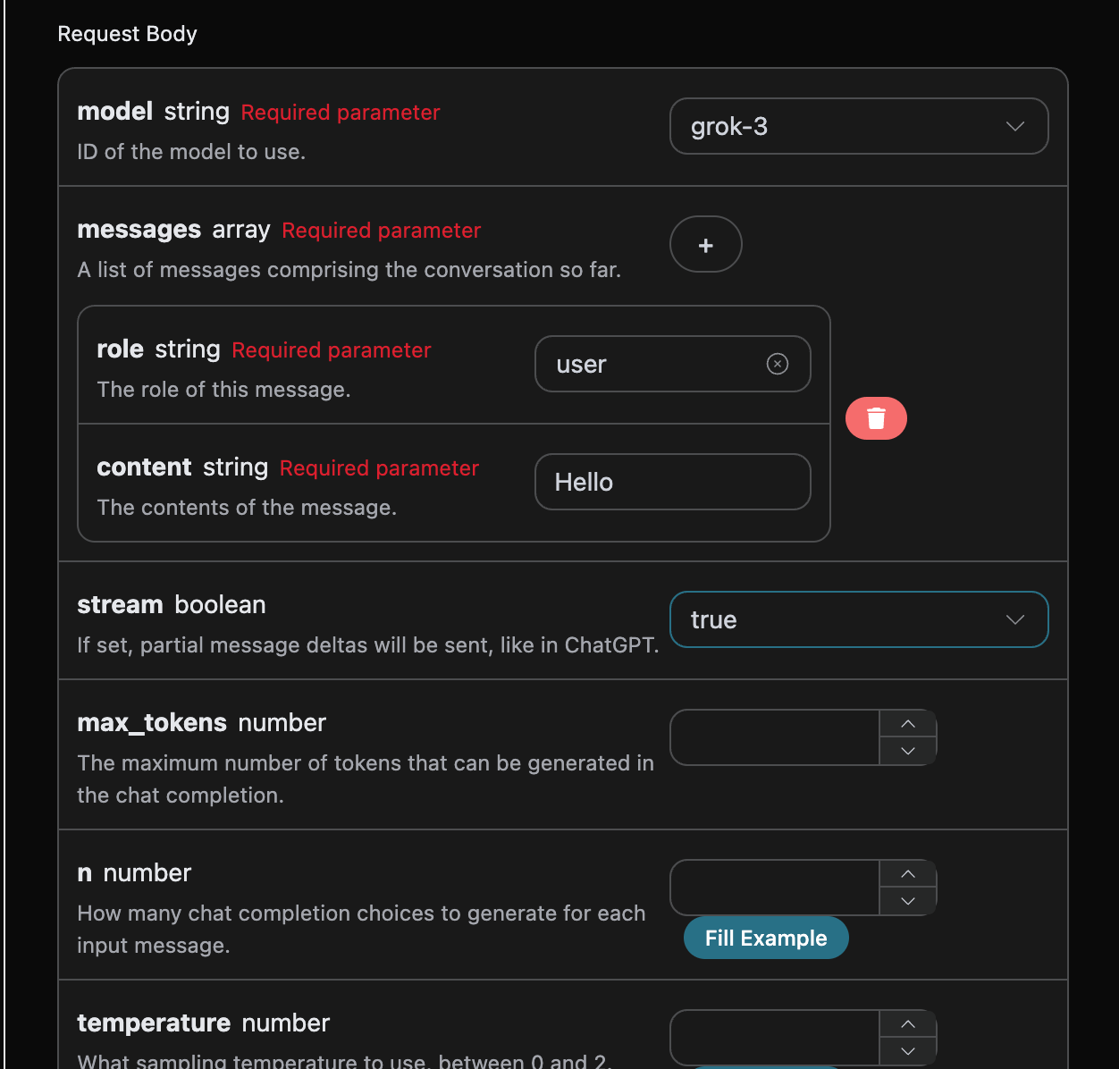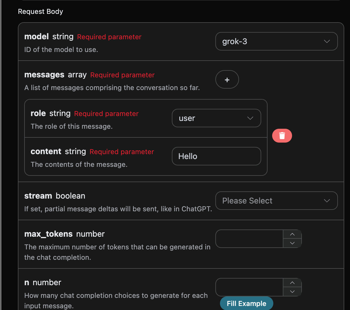 在第一次使用该接口时,我们至少需要填写三个内容,一个是 authorization,直接在下拉列表里面选择即可。另一个参数是 model, model 就是我们选择使用 Grok 官网模型类别,这里我们主要有 8 种模型,详情可以看我们提供的模型。最后一个参数是messages,messages是我们输入的提问词数组,它是一个数组,表示可以同时上传多个提问词,每个提问词包含了 role 和 content,其中 role 表示提问者的角色,我们提供了三种身份,分别为 user 、assistant、system 。另一个 content 就是我们提问的具体内容。
