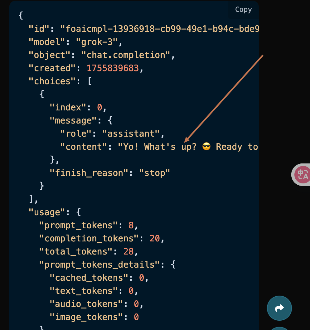 可以看到,choices 里面的 content 字段包含了 Grok 回复的具体内容。
