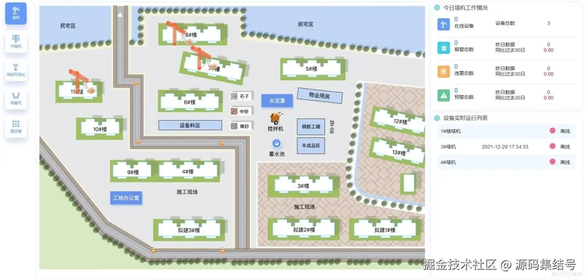 针对塔吊作业中的超载、碰撞、违规操作等安全隐患,本系统实时监测塔机运行状态,具备载重预警、区域禁行、群塔防碰撞等功能。所有运行数据与报警信息实时上传至云平台,实现多维度数据分析与远程可视化监管,为施工单位与安全监督部门提供全面的塔机安全管控服务。