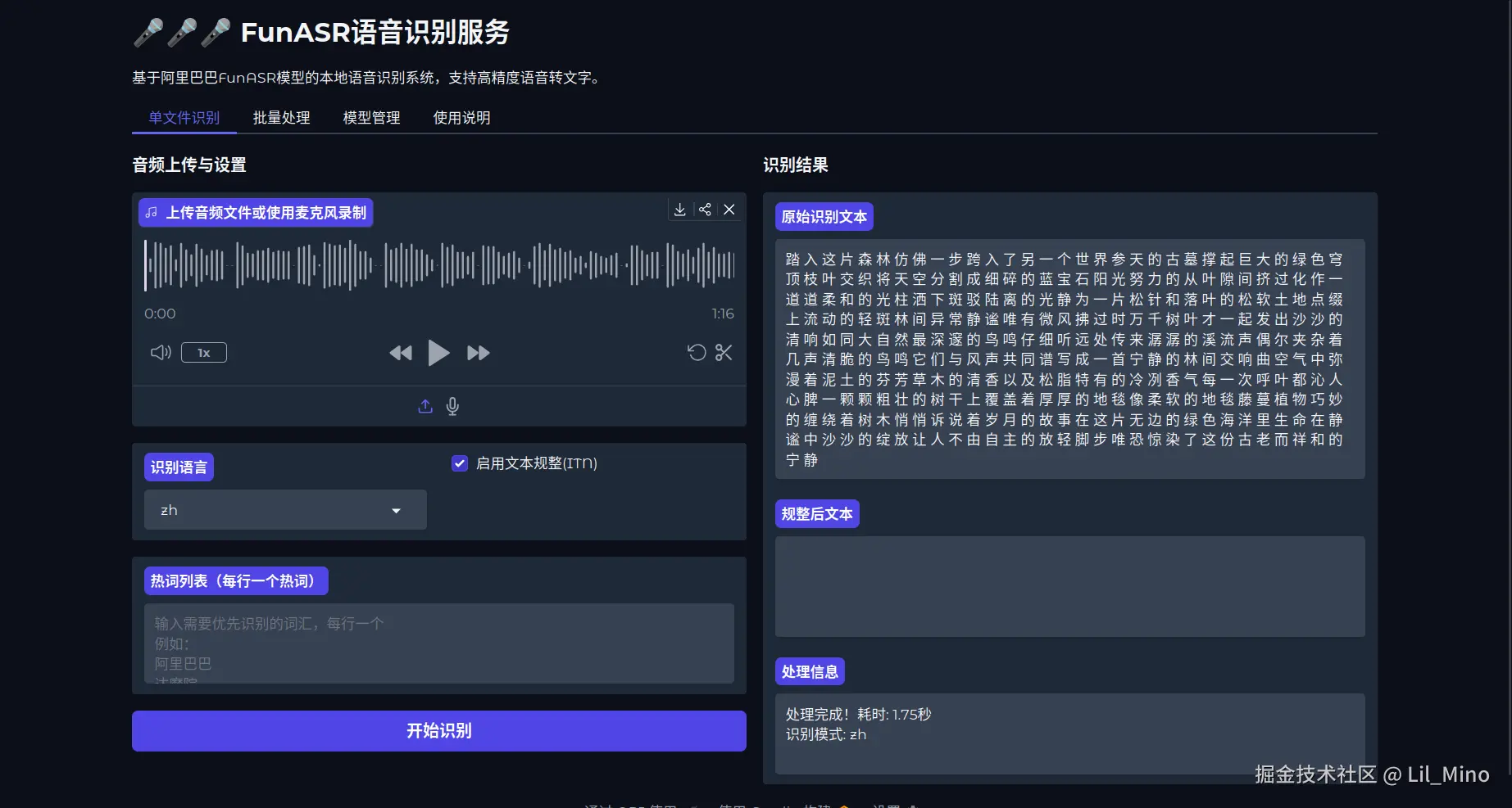 基本使用:几行代码即可体验语音识别功能。
