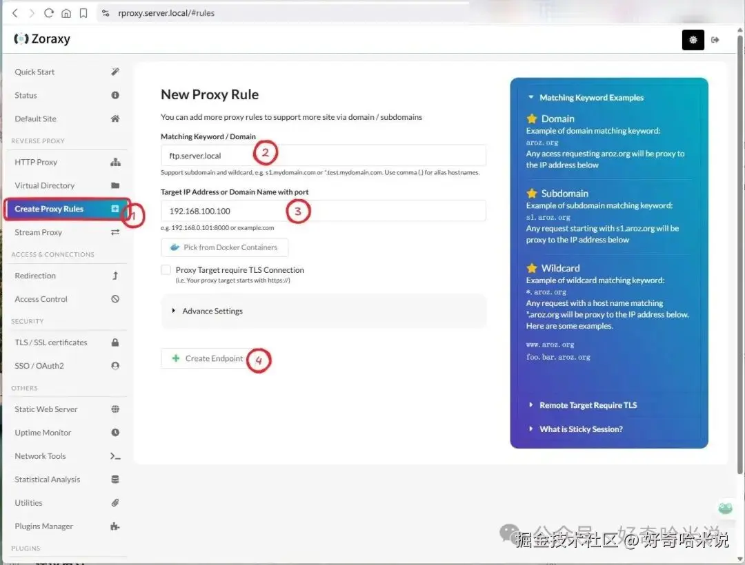 登录Web界面后,添加反向代理规则很简单: