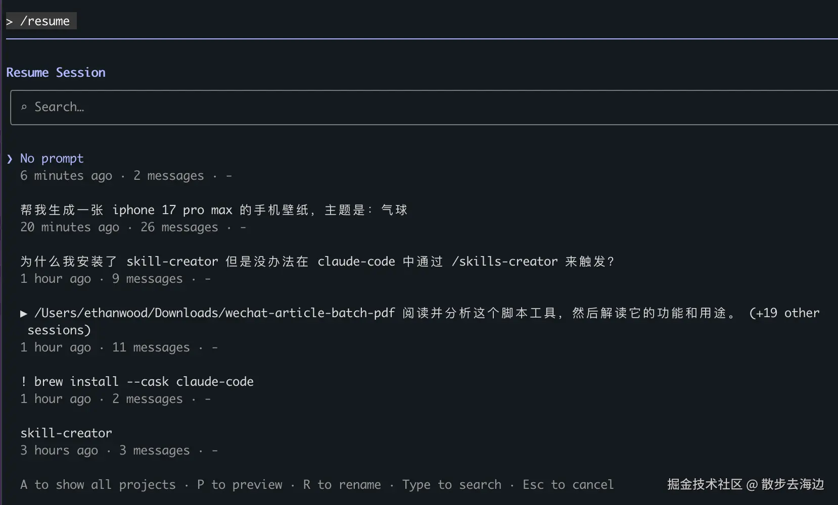继续之前的某个会话。这个场景是有时候中断对话了,CC 退出了,那么想继续之前的任务,就可以使用这个命令,CC 会列出所有会话历史,你选中一个就可以恢复了