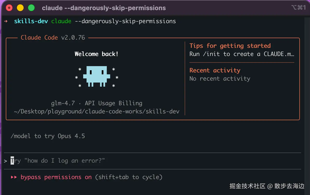 通常来说在终端中使用 claude 命令来启动 CC ,但是实际跑任务的时候 CC 会频繁的请求权限,需要你一直盯着,手动确认,所以可以通过 claude --dangerously-skip-permissions直接进入危险模式,这个模式下 CC 的任何工具调用都会自动执行(有一定风险,取决于你在用 CC 干什么)