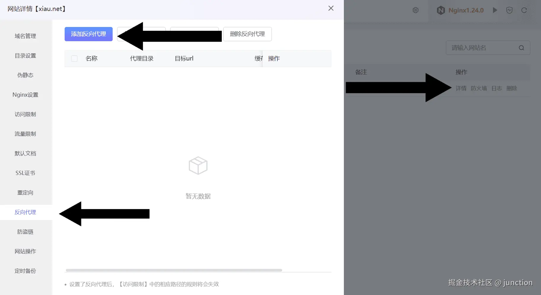 然后点击你刚刚创建站点旁边的详情,再点击反向呆哩,选择添加反向呆哩