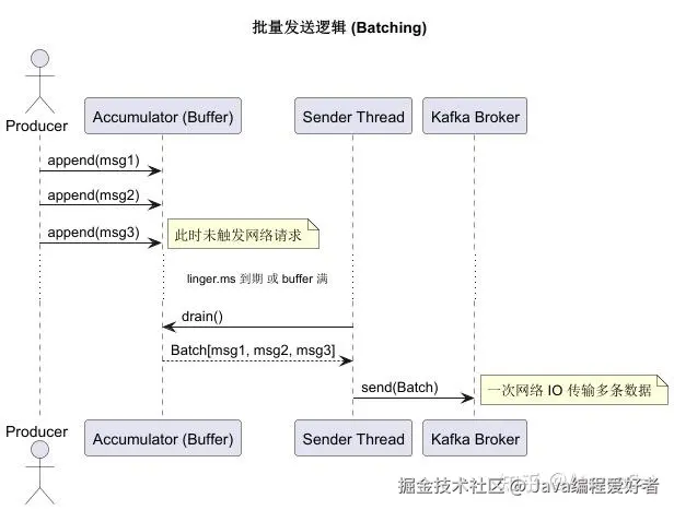 如果你一条一条消息发给 Kafka,网络 RTT(往返时延)会教你做人。Kafka 客户端会把消息积攒到一定大小(batch.size)或一定时间(linger.ms)再发送。
