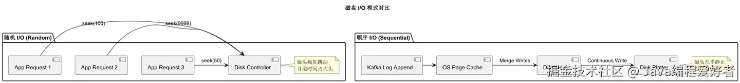 - 随机 I/O:磁盘磁头需要频繁寻道(Seek),这是物理机械动作,极慢。即使是 SSD,随机写的写放大(Write Amplification)和 GC 也会严重拖慢速度。