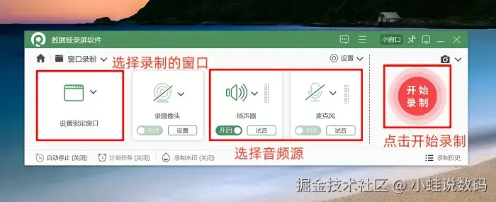以窗口录制功能为例,进入准备界面后,用户可自由设置录制窗口(全屏/自定义)、选择音频源、开启摄像头,需精细调节视频参数的用户,点击右上角 【设置】 即可操作。所有参数确认后,点击 【开始录制】 按钮或按下 【Alt+A】 快捷键即可启动;