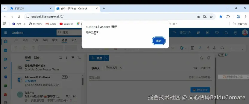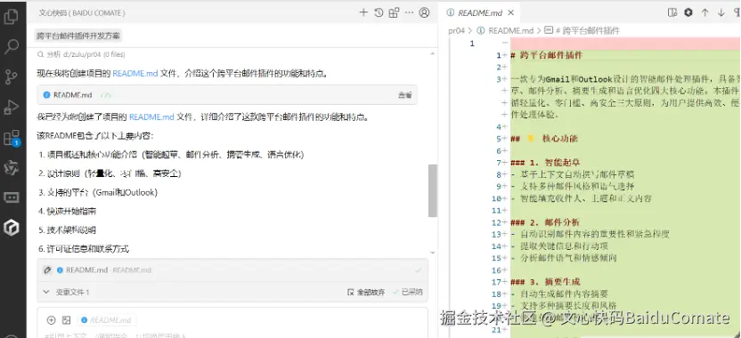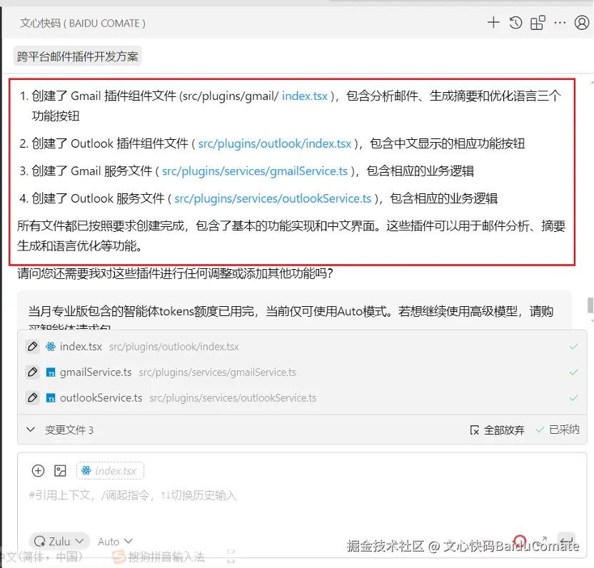 在这次开发中,Comate Zulu不再是简单的代码生成工具,而是能与我同频协作、精准落地需求的“全能编程助手”。项目始于一个清晰的核心诉求:打造一款适配Gmail和Outlook的跨平台邮件插件,实现智能起草、邮件分析、摘要生成、语言优化功能,并且做到轻量化、零门槛、高安全。