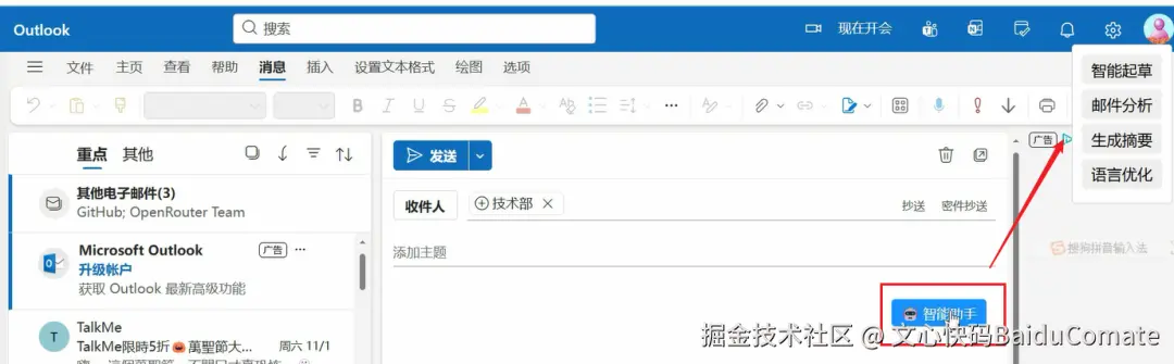 点击插件图标里的 “打开outlook”,进去后点左上角 “撰写”,编辑器右上角会出现智能助手按钮——这就是你的 “邮件外挂” 入口啦~
