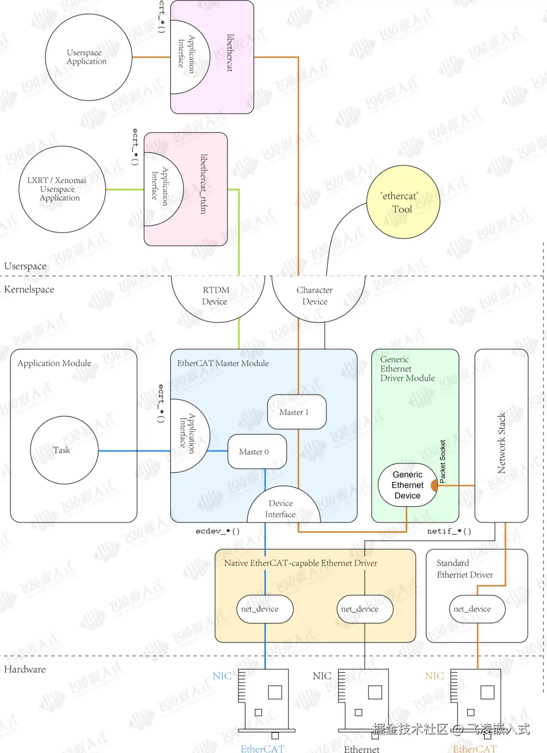 IgH EtherCAT则是运行于Linux系统的开源EtherCAT主站程序,IgH EtherCAT主站通过构建Linux字符设备,应用程序通过对字符设备的访问实现与EtherCAT主站模块的通信。