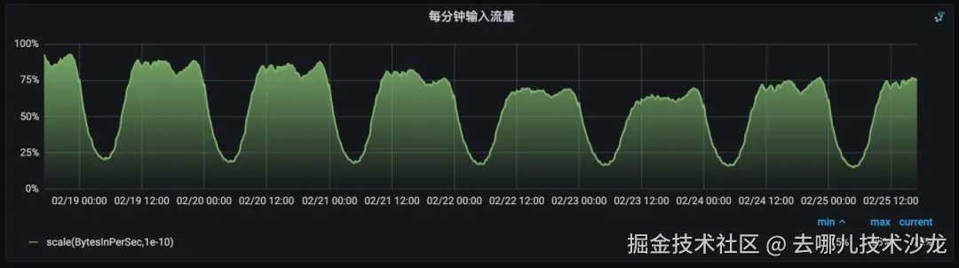 网络闲置率:是 KAFKA 服务的一个重要指标,即网络线程池线程平均的空闲比例,通常用于衡量集群的繁忙程度。集群没有流量时为最大值1,随着集群压力变大会逐渐变小,达到0.3以下集群性能就会达到瓶颈,就表明你的网络线程池非常繁忙,集群无法保证读写请求的及时处理,造成生产丢数以及消费堆积的问题。需要通过增加网络线程数或将负载转移给其他服务器的方式,来给该 Broker 减负。